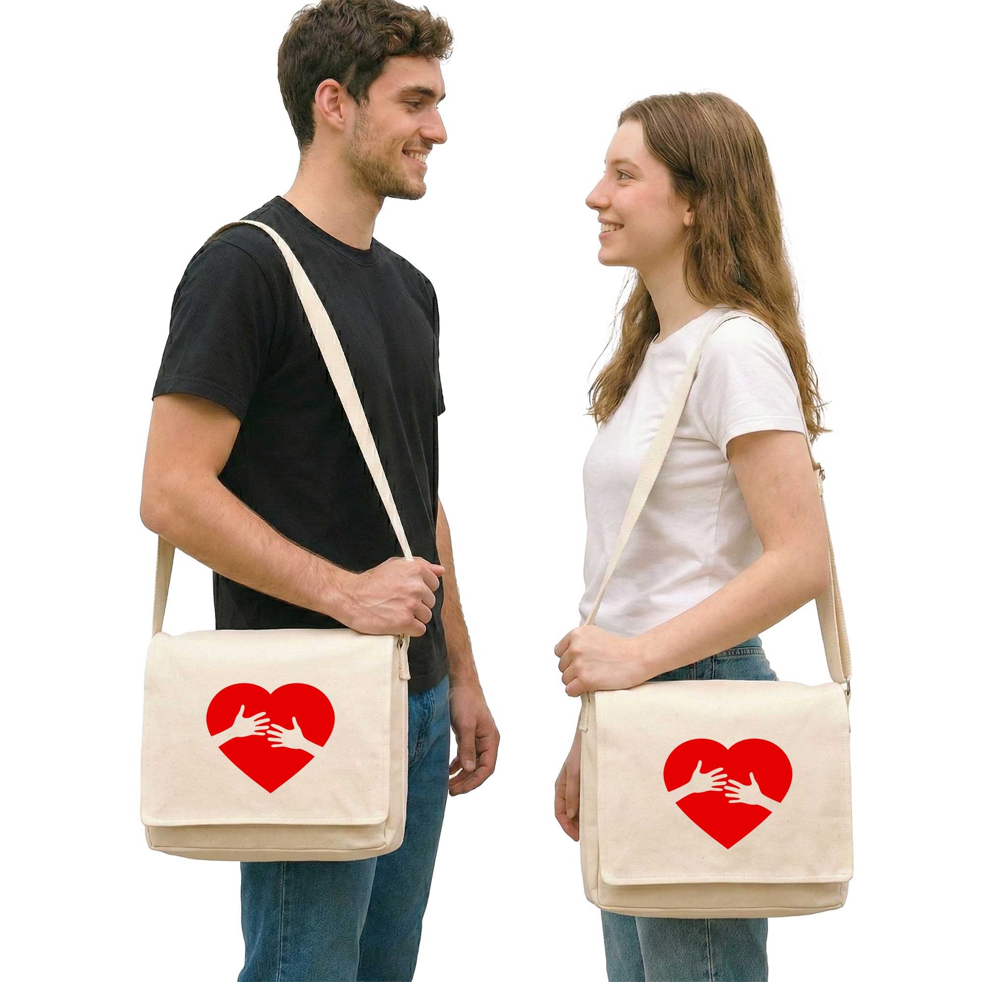 Kalp ve Eller Sevgili Çift Postacı Çantası Kanvas