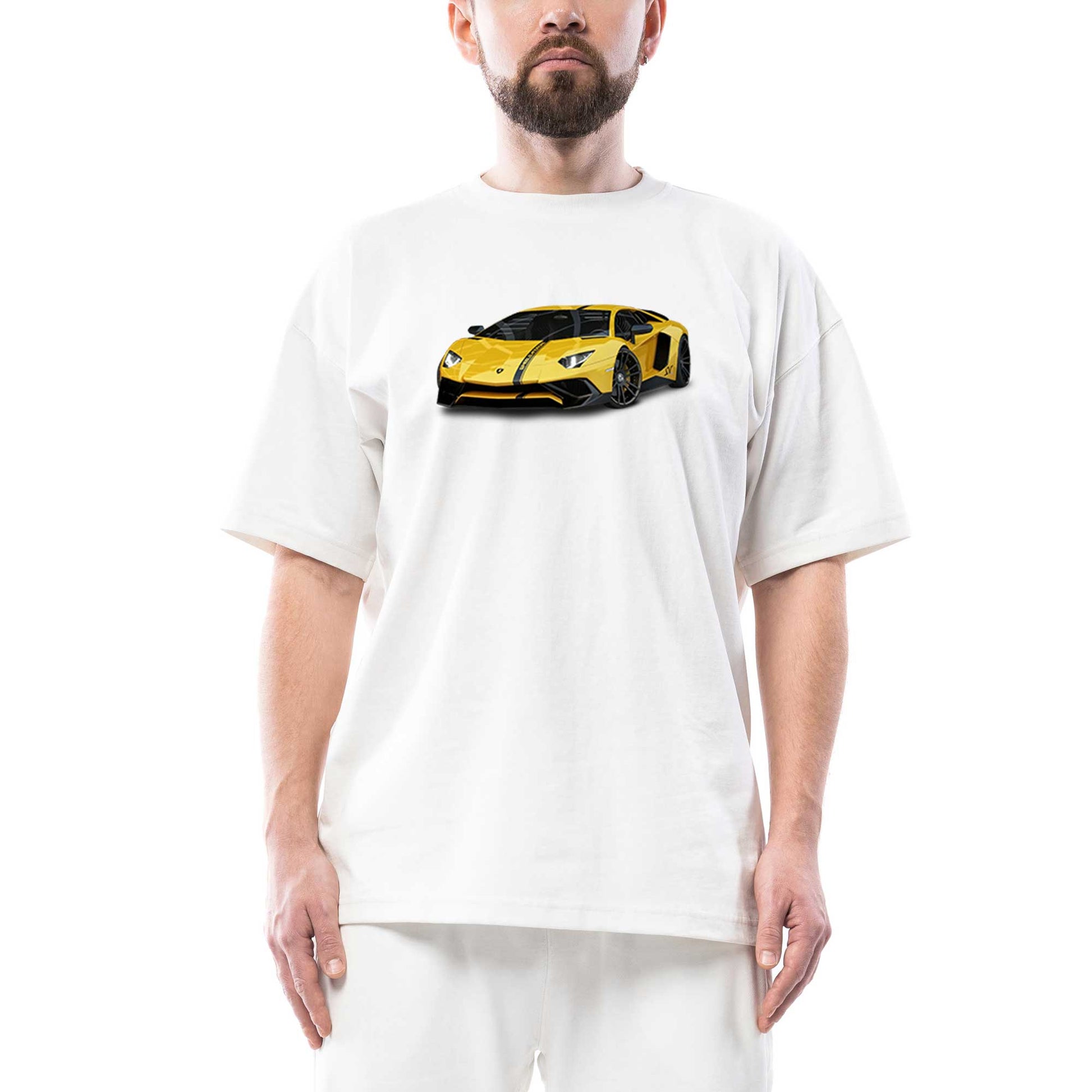 Lamborghini Aventador Yellow Oversize Beyaz Tişört