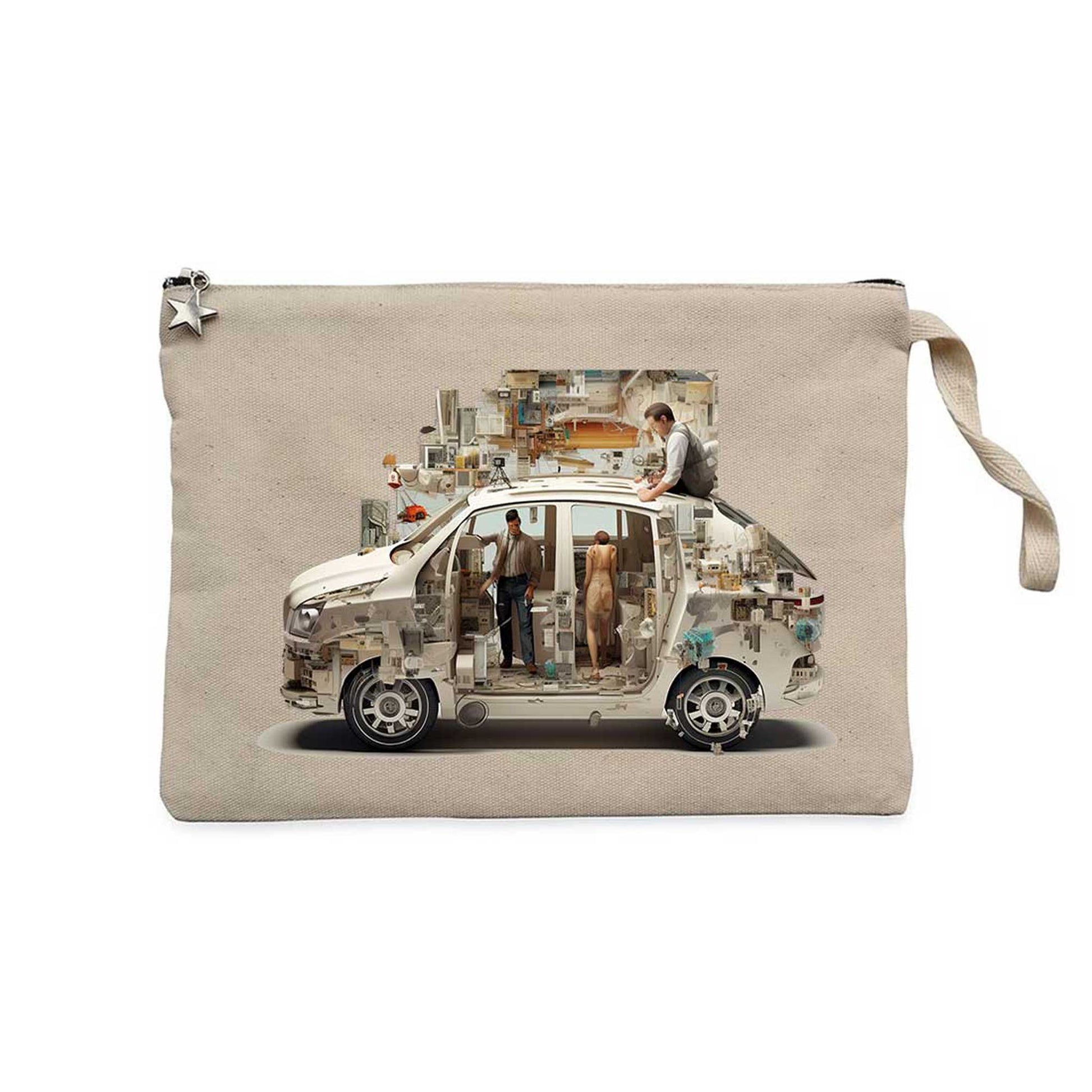 Self Driving Car Krem Clutch Astarlı Cüzdan / El Çantası