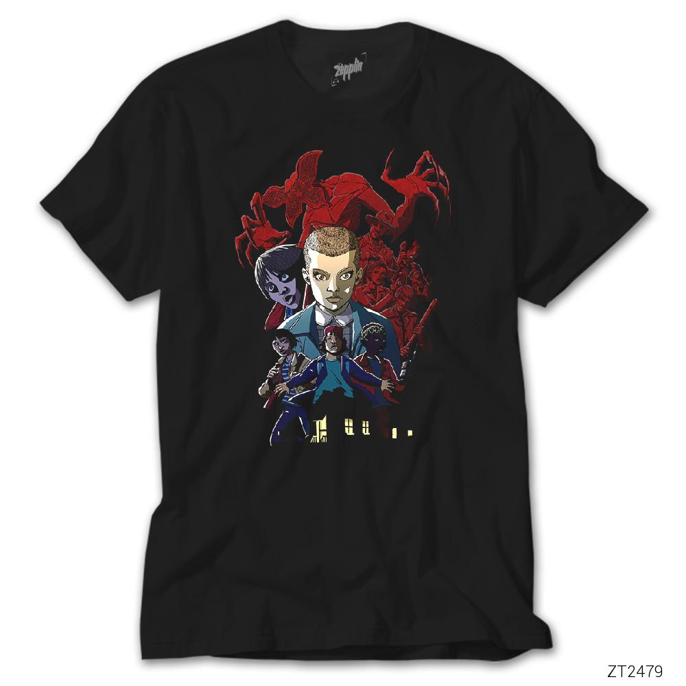 Stanger Things Cartoon Siyah Tişört